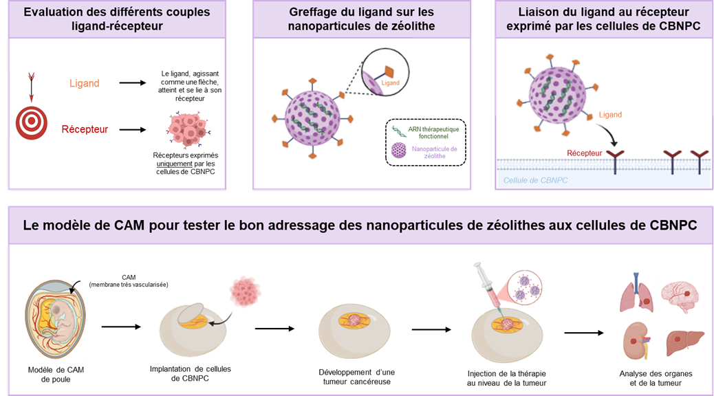 La formation des cancers bronchiques non à petites cellules (CBNPC) et de leur métastase est soutenue par la dérégulation d’un acteur de la voie de signalisation Hippo, la kinase NDR2. La voie Hippo (pour Hippopotame) contrôle la prolifération cellulaire et la taille des organes, elle agit comme un frein puissant contre le cancer. Nous développons une approche thérapeutique innovante basée sur la délivrance d’un ARN thérapeutique, visant à limiter l’expression de NDR2, par des nanoparticules de zéolithes. Si l’efficacité de cette approche, a pu être démontrée in vitro, sur des cellules de CBNPC, il est maintenant nécessaire d’identifier une modalité d’adressage préférentiel, de ces nanoparticules médicaments aux cellules de CBNPC dans un modèle plus complexe, in vivo, tel que le modèle de membrane chorio-allantoïdienne (CAM) de poule, membrane très mince, richement vascularisée qui entoure l’embryon dans un œuf fécondé.